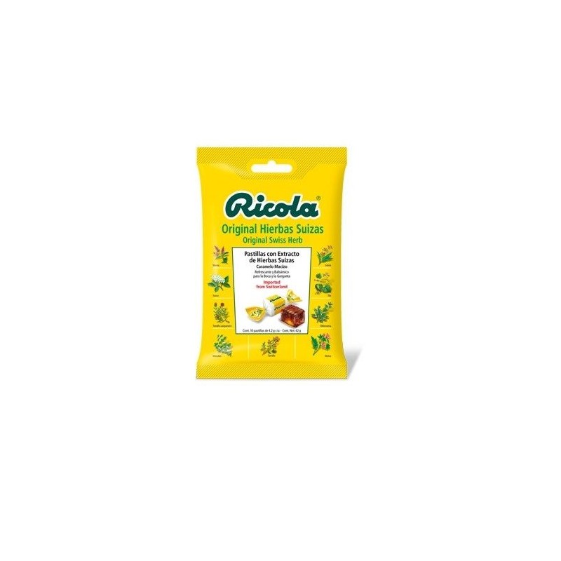Isomaltosa, sorbitol, mentol, extracto (0,2%) de eucalipto y de la mezcla de hierbas Ricola, edulcorantes (aspartamo, acesulfamo K), aroma natural de eucalipto, colorante (clorofilas).
