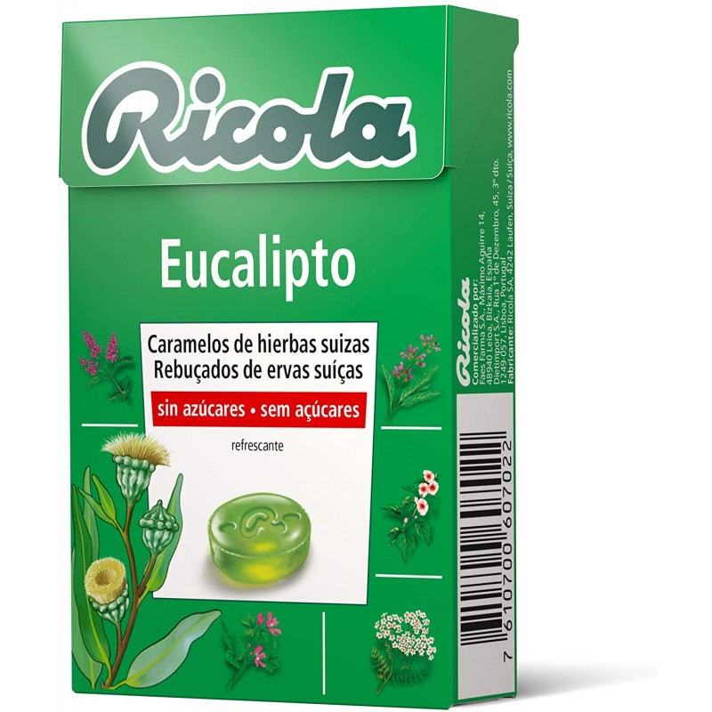 Isomaltosa, sorbitol, mentol, extracto (0,2%) de eucalipto y de la mezcla de hierbas Ricola, edulcorantes (aspartamo, acesulfamo K), aroma natural de eucalipto, colorante (clorofilas).